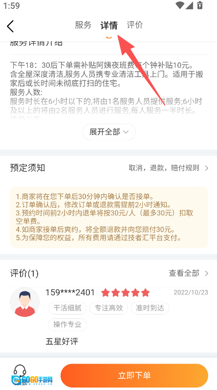 2、支持服务详情查看功能,可获取服务内容、预定须知、评价等信息,以便了解服务的具体细节。
