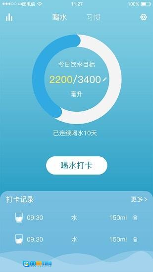 1、进入软件首页后,即可查看自己制定的喝水计划以及该计划的完成情况,让用户能够随时了解自身的饮水进度。