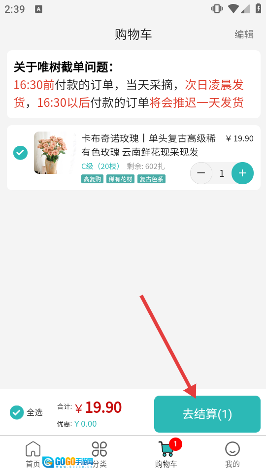 4、进入购物车页面后,点击【去结算】按钮,然后根据后续出现的提示完成相应操作。