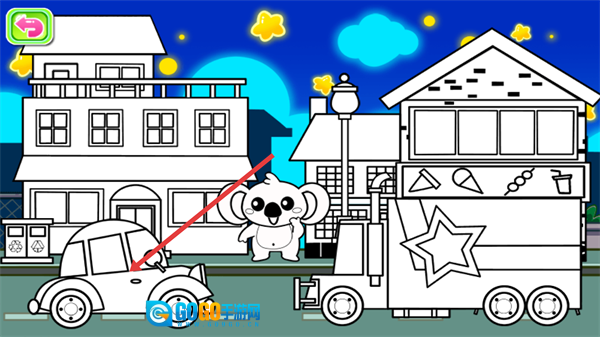 进入城市涂色界面后,映入眼帘的是黑白的城市建筑、车辆以及考拉形象,此时只需选择并点击汽车,即可为后续的颜色填充操作做好准备。