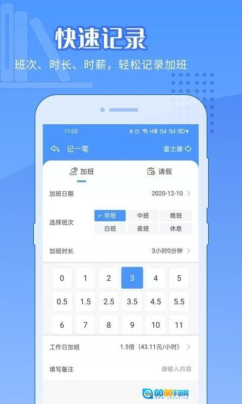 2、记录上班班次:早班、中班、白班、晚班,可通过记加班功能记录您的上班时间;