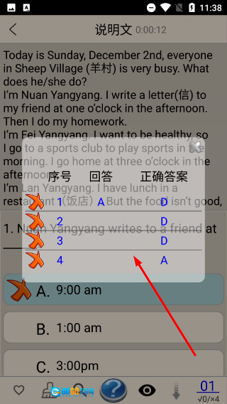 4、完成作答后,你可以查看题目【序号-回答-正确答案】的比对信息,借助结果反馈来了解自己的答题情况,进而优化阅读练习。