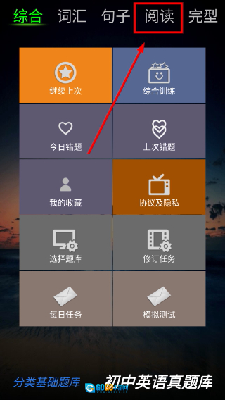 1、进入功能界面后,点击顶部的【阅读】标签,即可切换到阅读模块。在该模块下,你可以选择【继续上次】【综合训练】等功能选项,以此来进行阅读练习。