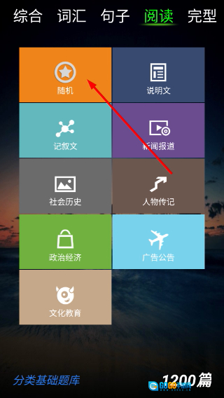 2、在阅读模块的分类页面,点击【随机】按钮,就能随机挑选阅读材料的类型。