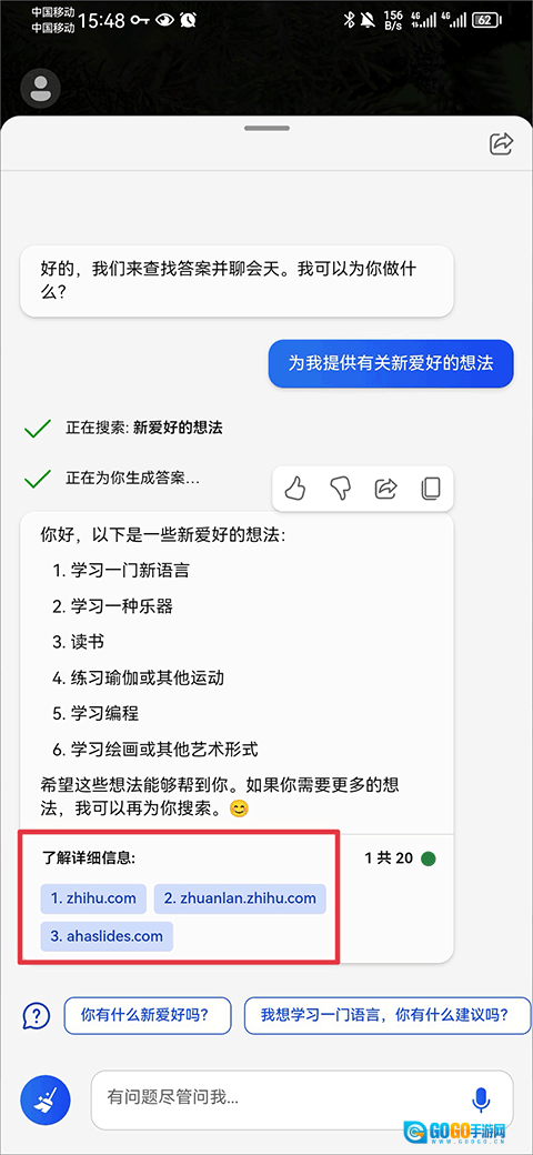 4、在聊天互动过程中,你能够自然流畅地进行交流,并且可以在初次搜索的基础上进一步提出后续问题,从而得到更贴合个人需求的回复。