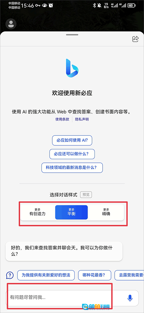 2、进入后选择一种对话模式:若想体验充满想象力的聊天,可选择“有创造力”模式;“平衡”模式能带来信息丰富又友好的交流;“精确”模式则主打简洁直截了当的对话。选好模式后,在下方输入你想聊的内容,也可以通过语音输入对话。