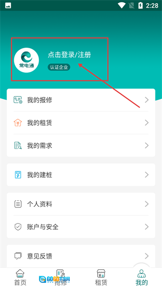 进入个人中心后,点击顶部的【点击登录/注册】区域,就能进入登录页面,这个页面同时也设有我的报修、我的租赁等功能的入口。