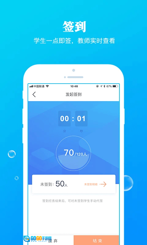 3、便捷签到功能,学生轻点即可完成签到,老师可随时查看签到情况。