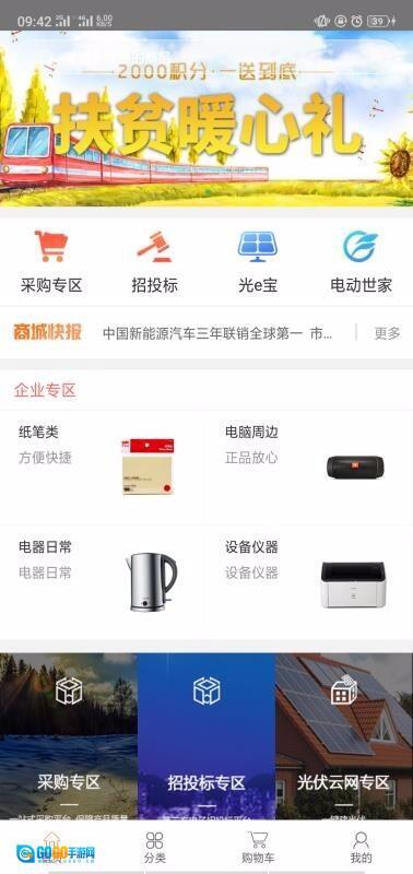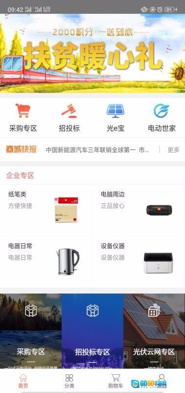 2、进入首页后,你可以看到采购专区、招投标、光e宝、电动世家等各类功能选项,此外还有专门展示企业产品的企业专区。