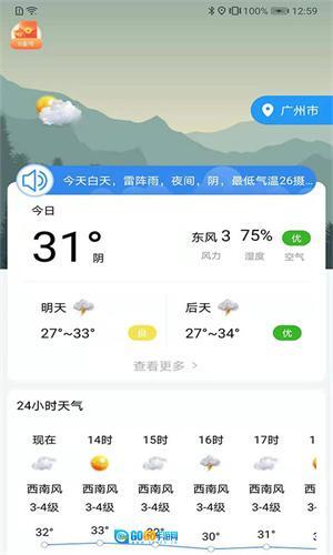 - 以逐小时的形式展示降雨状况,便于用户更轻松地了解相关信息,同时也能查看当天24小时的天气变化;
