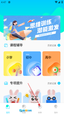1、在应用首页,点击底部的【故事】按钮,即可进入故事页面。