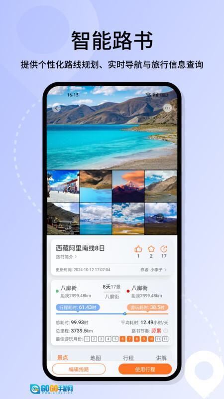 2、集成了路书编辑、景点讲解与团队出行工具,为旅行者打造从行程规划到旅行记录的一站式服务体验。