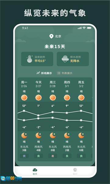 观测天气变化,预知未来趋势,借助科学的分析与精准的预测,助力你合理规划出行和日常生活安排,使你在接下来15天里,能清晰把握所处地区的天气走向,及时应对天气的突然变化。