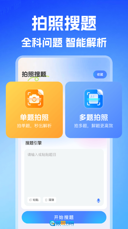 2、进入首页后,平台具备单题、多题拍照搜题功能,同时提供搜题引擎服务。