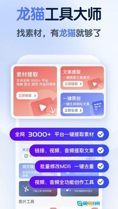 1.找素材,有龙猫工具大师就够了。不管你需要视频、音频、图片还是文案类素材,它都能满足你的各类需求。 2. 龙猫工具大师是一款相当全面的手机万能素材处理工具,覆盖了从素材提取到编辑的整个完整流程。