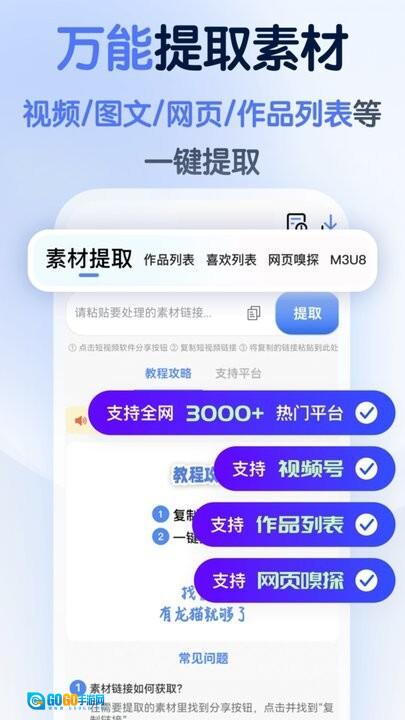 1.支持覆盖全网超3000个热门平台,可提取视频、图文、作品主页、收藏列表等多种类型的素材,能充分满足用户多样化的使用需求。