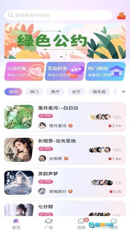 2、热门房间设有语音派对、主题辩论等趣味社交场景,广场则可供用户分享生活、发布话题并开展互动。