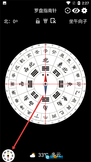 2、在【罗盘指南针-界面】中,点击左下角的小罗盘图标,就能进入罗盘样式的选择页面。