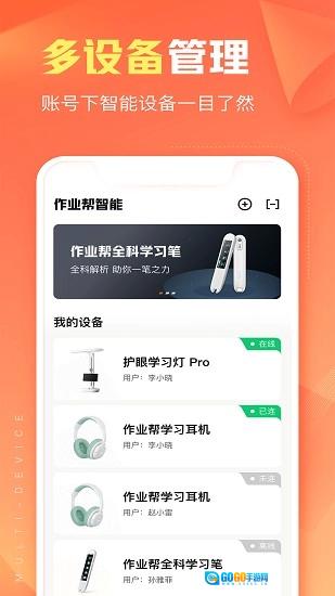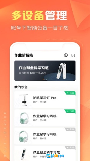 1、设备管理中心支持添加作业帮全科学习笔等硬件设备,单个账号能够管理多台设备,从而实现对全家孩子学习进度的统一监管。