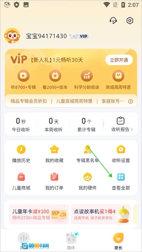 第一步:打开喜马拉雅儿童并完成登录,进入家长页面后,点击【查看全部】按钮,该按钮的位置可参考绿色箭头的指向。