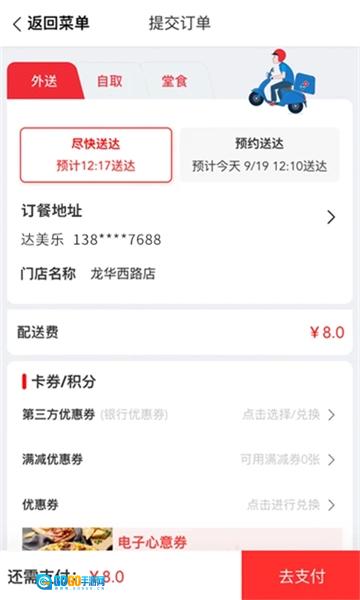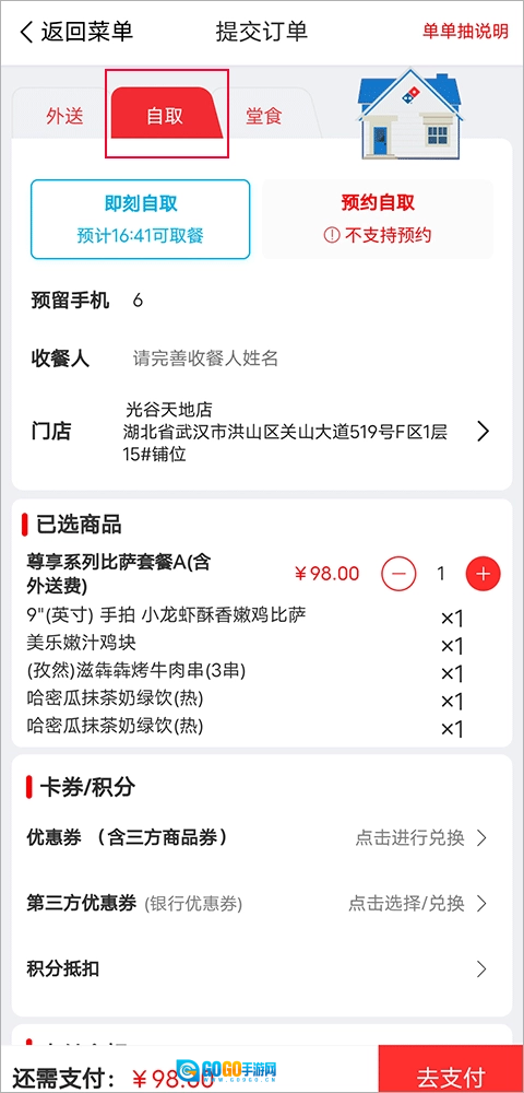 1、首先打开美乐比萨,选好想要的美食后,进入下单界面,选择“自取”选项,填写预留号码和收餐人信息,完成支付后,就可以到下单对应的门店自取餐品了。