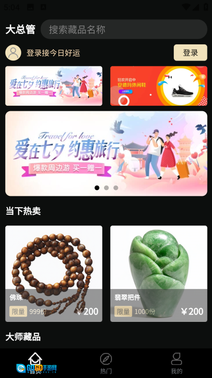 2、首页陈列着若干热门藏品,点击顶部的登录按钮,即可跳转至登录界面;