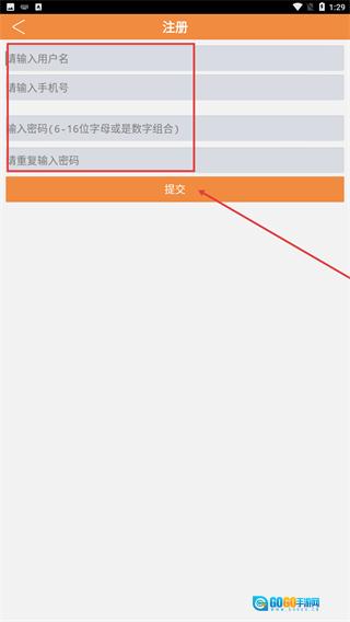 3、进入注册页面后,请按顺序填写【用户名】【手机号】【密码】【重复密码】这几项信息,全部填写完毕后,点击【提交】按钮即可完成注册流程。