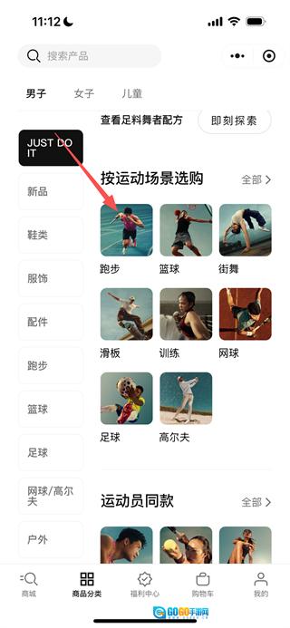 2、在商品分类页面,选择跑步场景选项,即可进入跑步类商品的列表页面。