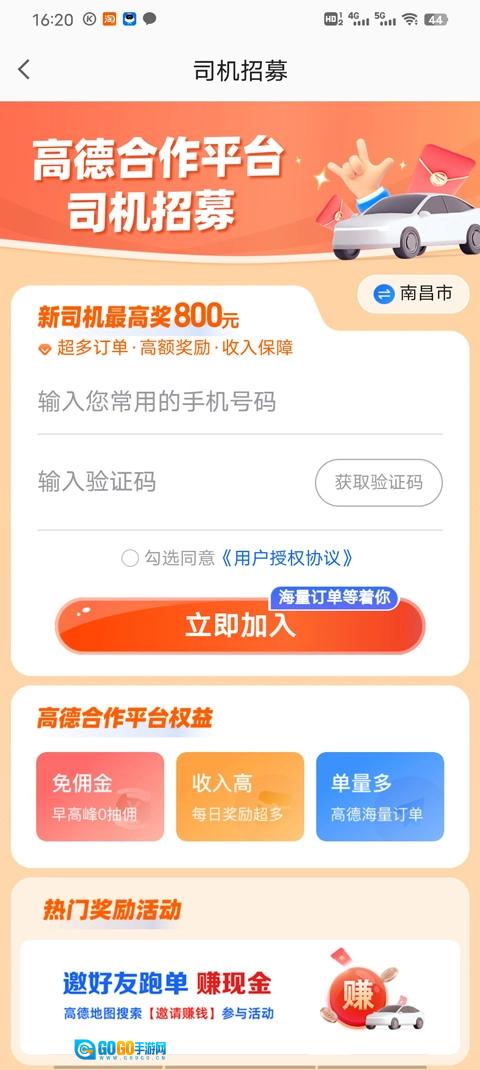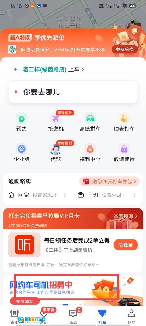 1、首先打开应用,进入打车首页面后,就能看到招募司机活动的图片,点击进入即可。