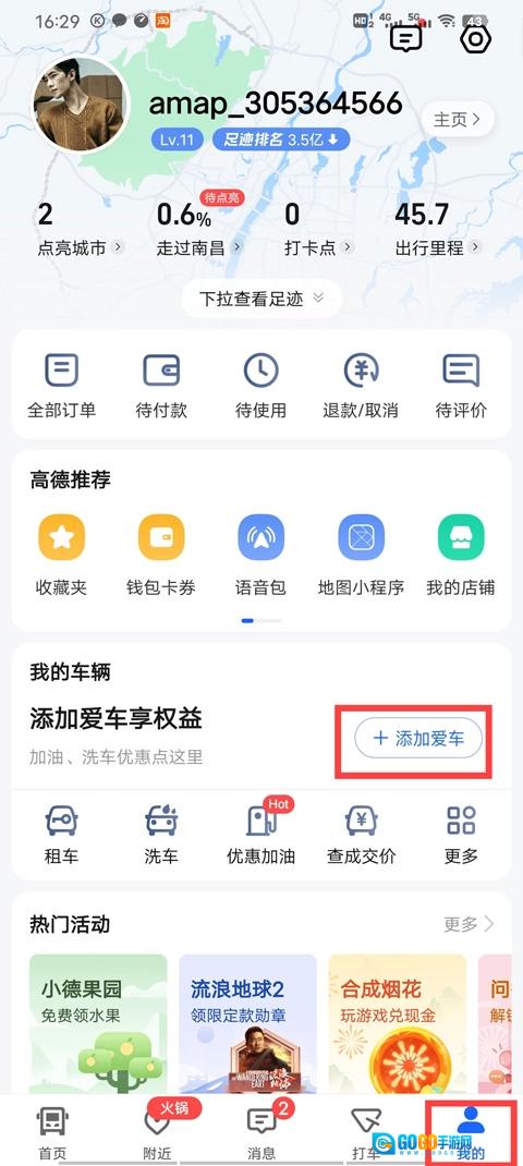 1、进入高德地图后,选择我的,点击添加爱车;