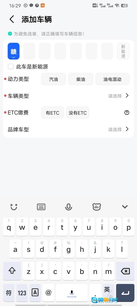 2、填写车牌号、汽车类型、品牌、是否安装ETC等信息,然后点击完成按钮。