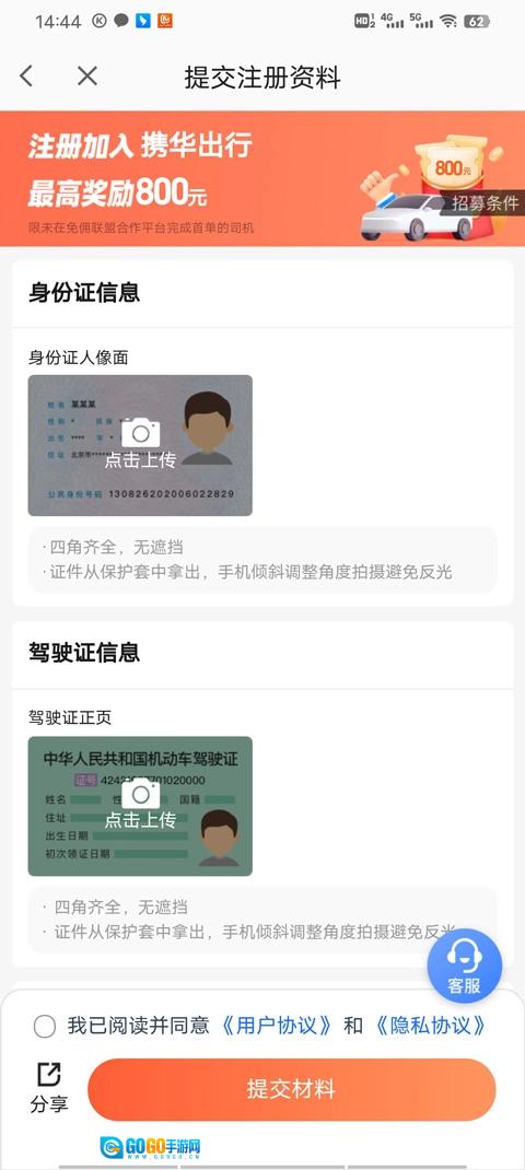 4、输入身份证与驾驶证信息,勾选“我同意协议”,点击提交材料,之后只需等待系统审核通过,即可正式开始接单。