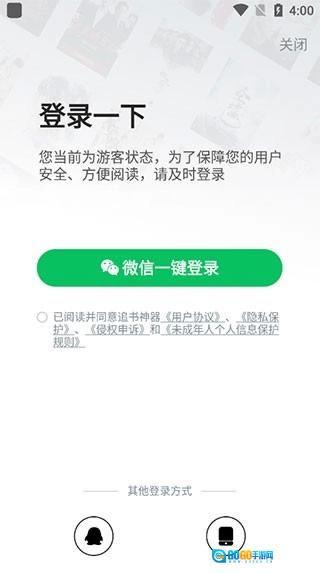 1、首先打开追书神器,支持微信一键登录,也可以选择使用QQ或手机号进行登录。