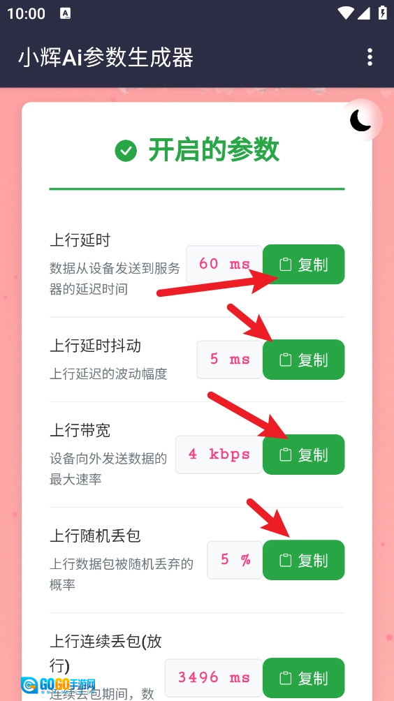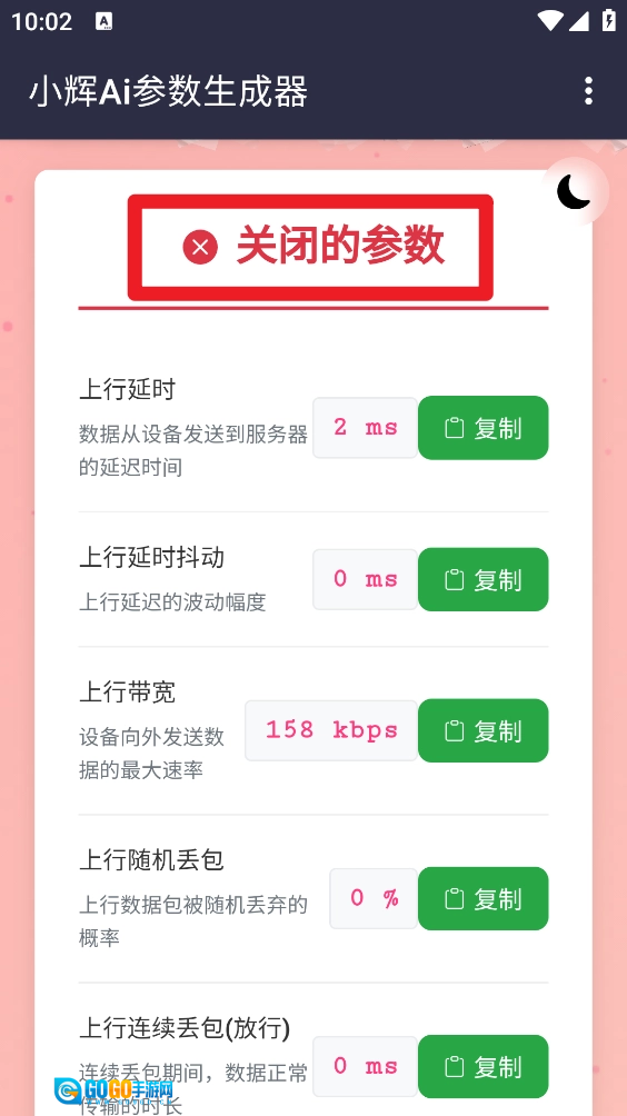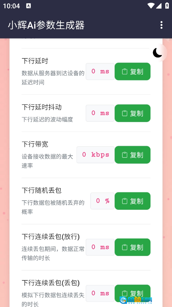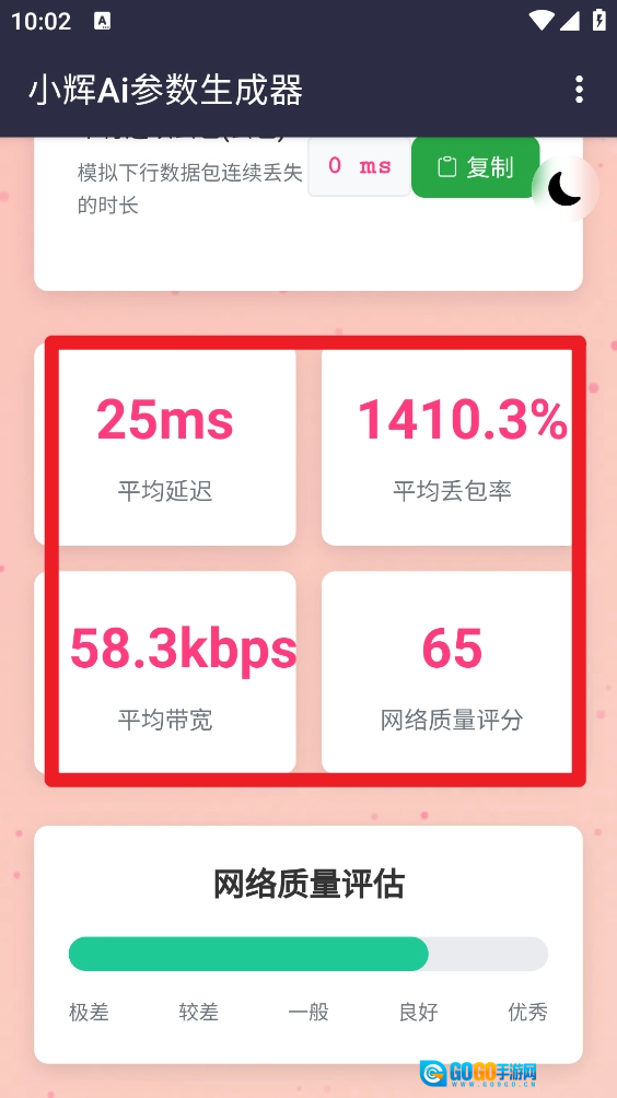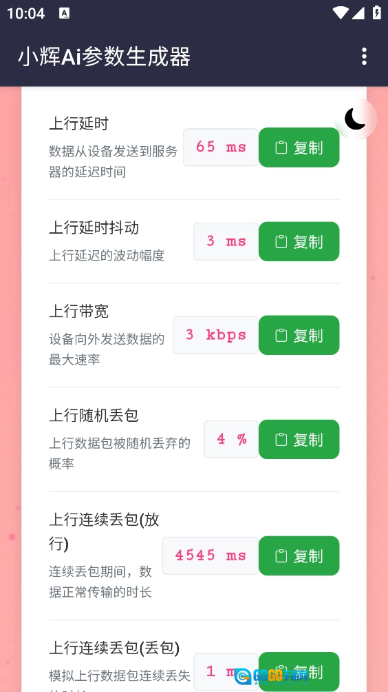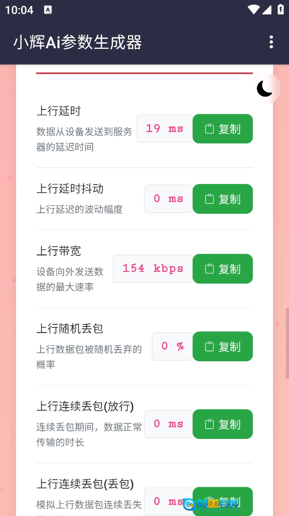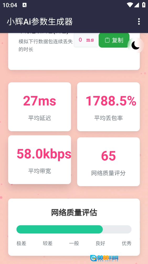 小辉Ai参数作为一款好用的模拟弱网参数生成器,功能十分强大。它无需Root权限,会自动分析当前的网络状况与配置,随后一键生成最适配的参数设置。此外,它还支持复制所有参数,像延时、抖动、带宽等,都能一键复制并直接使用。