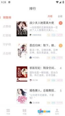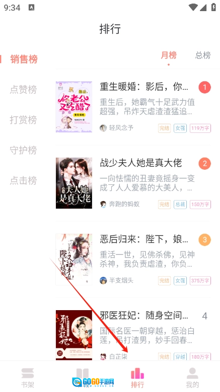 3、切换到排行榜页面,这里提供点赞榜、打赏榜、点击榜等榜单,你可以查看这些榜单对应的小说。