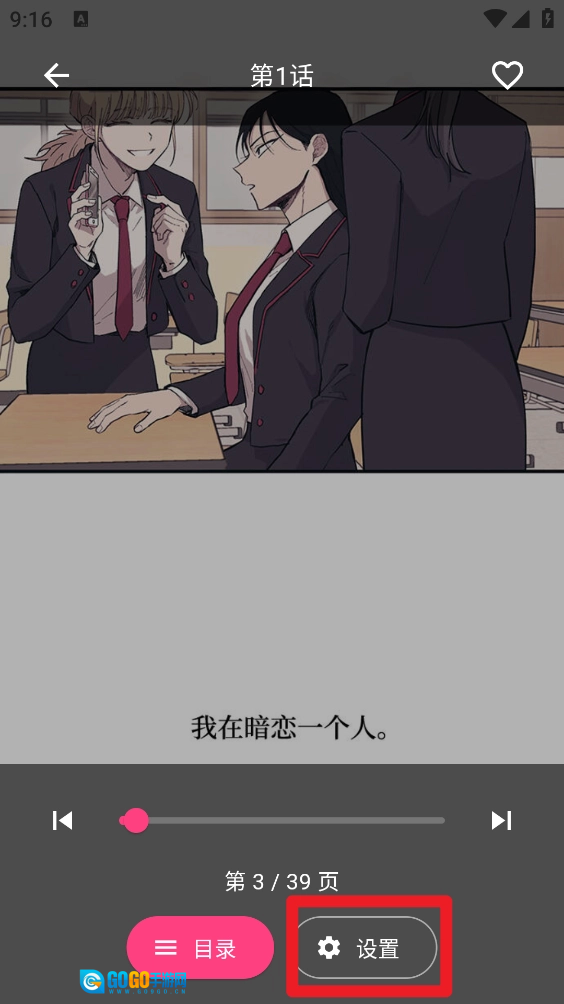 4、接着在漫画阅读界面点击中间区域唤出菜单,再点击“设置”选项。