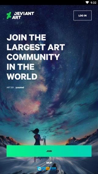 打开DeviantArt应用后,点击【Skip】按钮跳过初始引导页面,即可直接进入主界面。