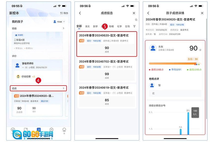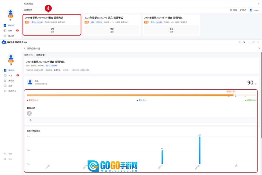 2、点击想要查看的考试批次,即可查看孩子本次考试的成绩情况分析、老师的点评以及班级成绩的整体情况分析。