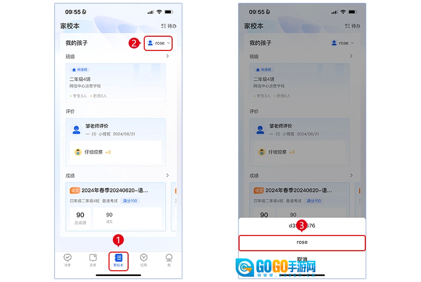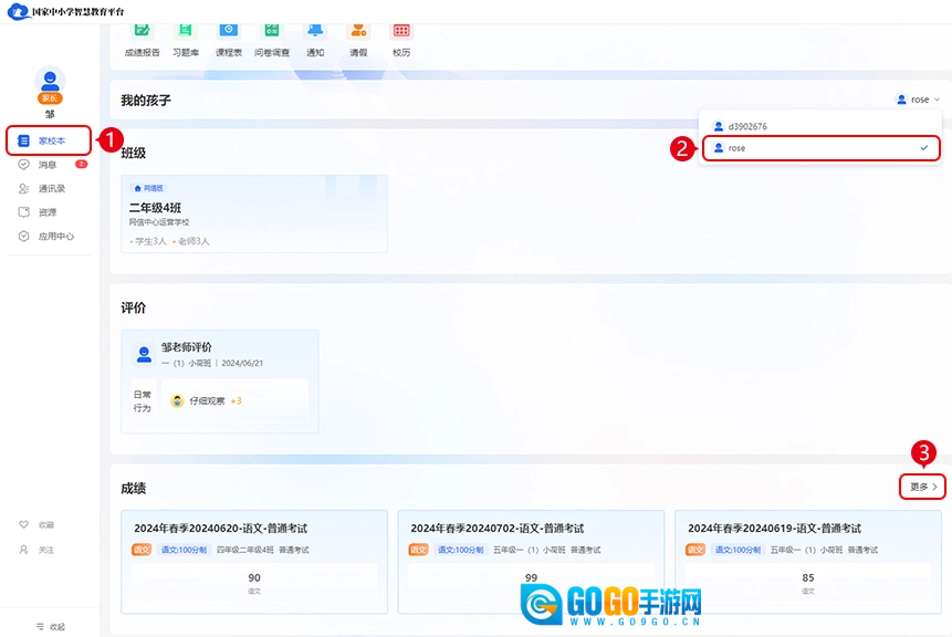 1、在左侧导航栏找到【家校本】,点击进入后选择【我的孩子】,从中挑选需要查看的孩子;接着在下方的【成绩】板块右侧,点击【更多】按钮,即可查看该孩子的全部成绩。