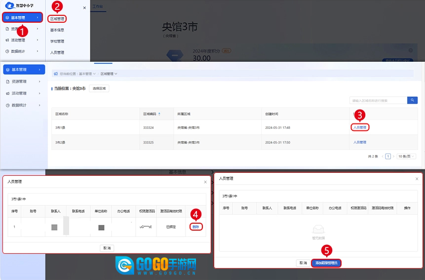1、若需更换区域超级管理员,您可联系上级区域管理员,通过【基本管理】-【区域管理】-【人员管理】删除原超级管理员,再通过【添加超级管理员】重新生成对应权限的激活码,并将激活码发送给新管理员完成绑定。