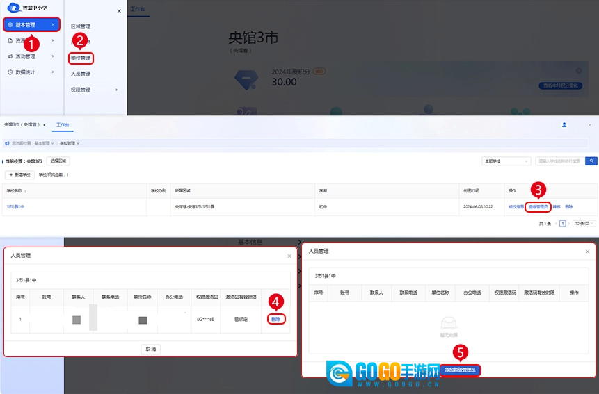 2、若需更换校级超级管理员,您可联系上级区域管理员,通过【基本管理】-【学校管理】-【查看管理员】删除原超级管理员,再通过【添加超级管理员】重新生成对应权限的激活码,并将激活码发送给新管理员完成绑定。