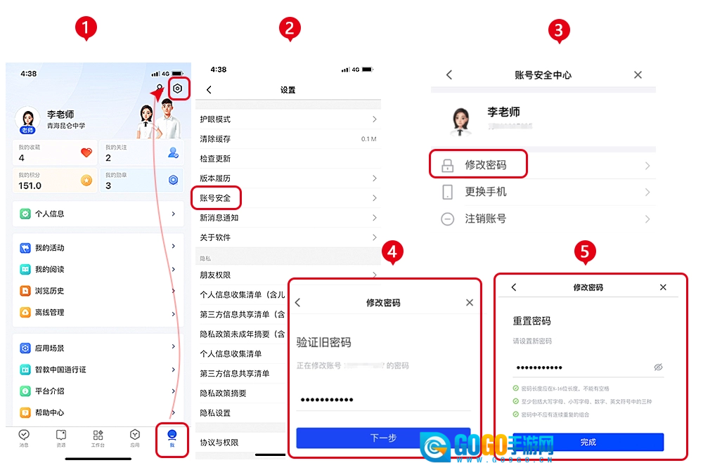 2、端:登录后,您可在底部导航栏点击【我】,进入后选择【设置】,接着找到【账号安全】选项,点击进入后选择【修改密码】,先输入旧密码完成验证,之后即可设置新密码。