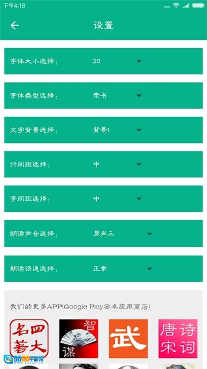3. 点击页面顶部的“设置”按钮,您可以自行设置字体、背景、翻页方式等与阅读相关的选项。