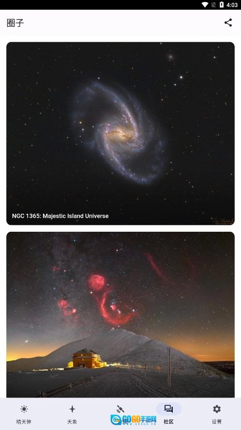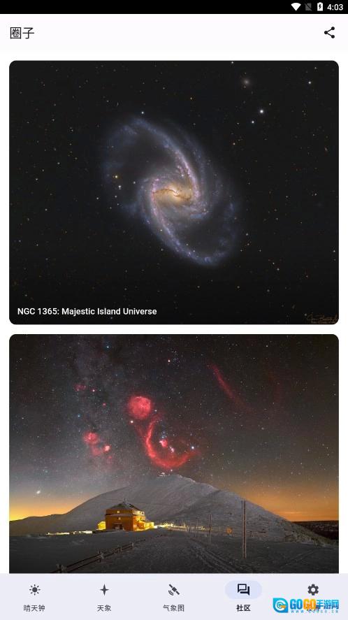 3、丰富的附加功能:配备光污染地图、卫星云图,还设有天文交流论坛,能够满足用户多方面的需求。