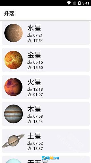 5、要是您对天体运动抱有浓厚好奇,不妨点击右上角的标识,在这里能查看各星球的升落时间,助您随时把握宇宙的脉动。
