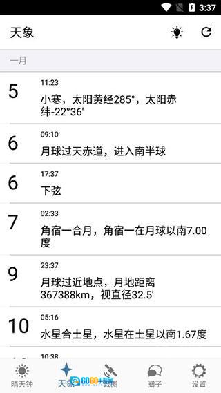 2、精准的天象预报:实时更新恒星、行星、卫星的升落时间等天象数据,为天文观测提供便利。