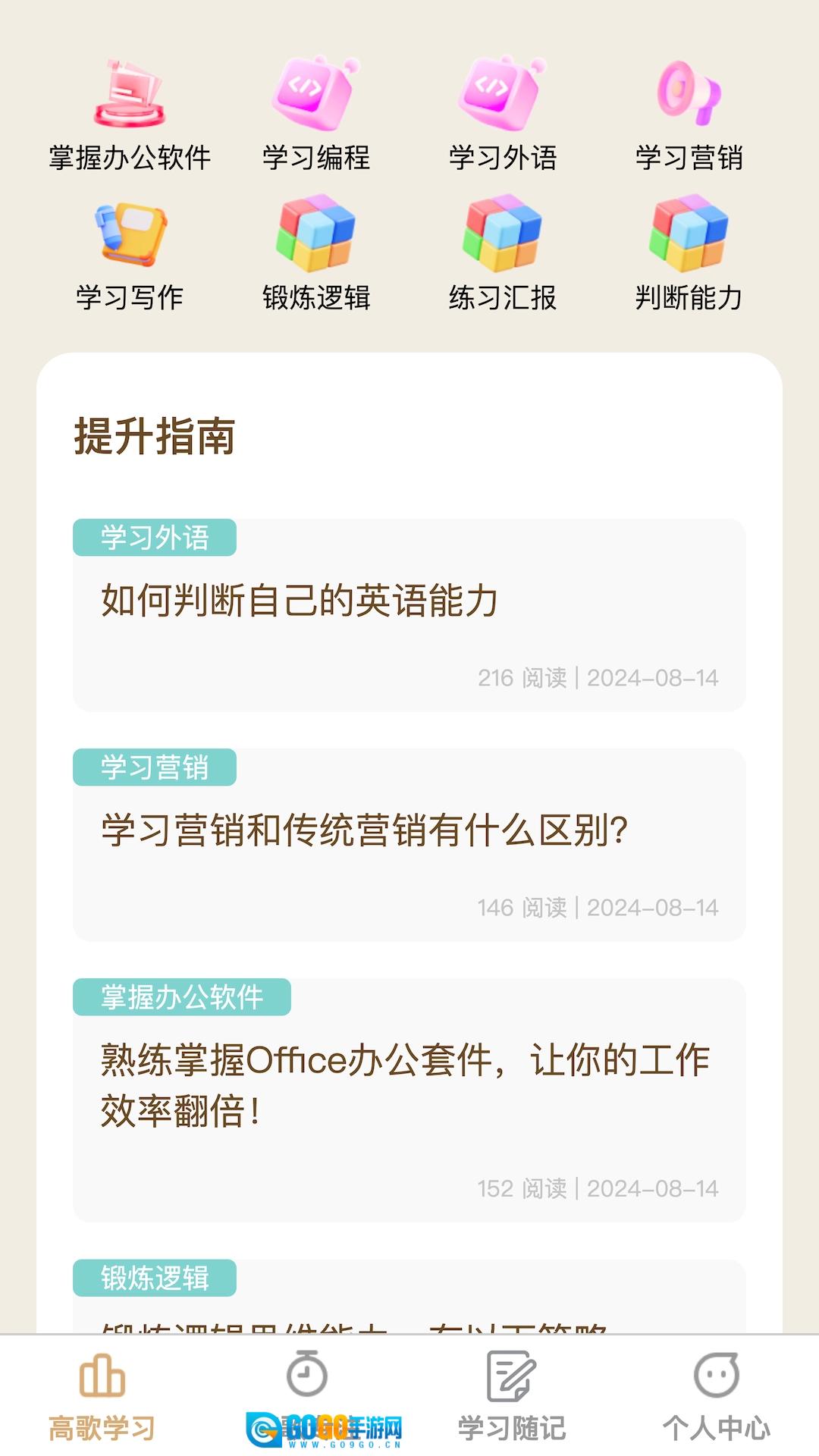 步步高歌是一款融合学习、专注与记录功能的应用,致力于为用户打造全方位的学习体验。用户可随时随地获取丰富多样的学习资源,从而提升自我认知水平与专业技能。无论您是在专业领域深入钻研,还是在个人成长道路上不断探索,步步高歌都能为您提供切实有效的支持与帮助,助力您在学习之路上稳步前行。