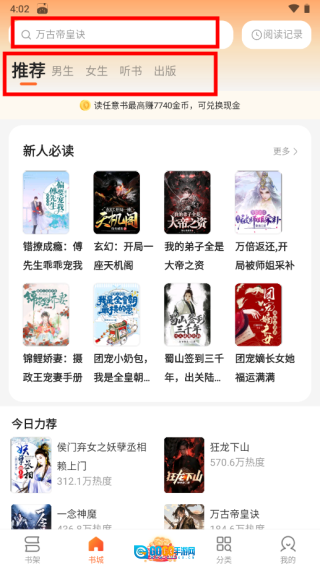 1、先在当快完成软件安装并进入应用,之后可以借助搜索栏搜索,或者通过分类导航的方式来筛选和挑选小说;