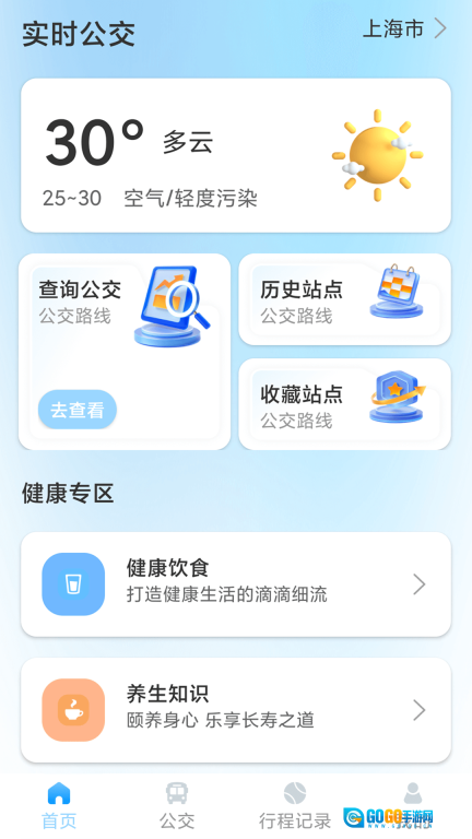 首页支持公交查询、历史站点查看与收藏站点功能,同时提供健康专区的相关信息。