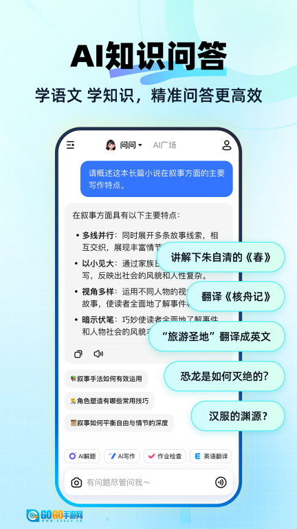 1、具备海量的知识储备,用户只需提出问题,AI就能快速给出精准的解答,涵盖了各个学科领域以及日常生活里的各类疑问。